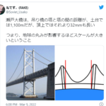 瀬戸大橋は、吊り橋の塔と塔の間の距離が、土台では1,100mだが、頂上ではそれより32mmも長いつまり、地球の丸みが影響するほどスケールが...