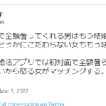 初対面で全額奢ってくれる男はもう結婚してるし、奢りかどうかにこだわらない女ももう結婚してる。 だから婚活アプリでは初対面で全額奢らない男と奢られないから怒る女がマッチングする。戦いが始まる。